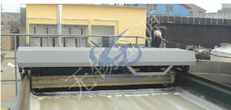 刮渣机可自动运行,当运行到终点时,依靠碰撞挡块,使刮渣板落下,同时通过行程开关自动换向运行,刮渣机开始将液面浮渣由池子的一端刮到池子的另一端。刮渣机回到起点后又依靠池壁的导程板,使装有导轮的刮渣板抬起,同时通过行程开关自动换向,完成一次刮渣行程。